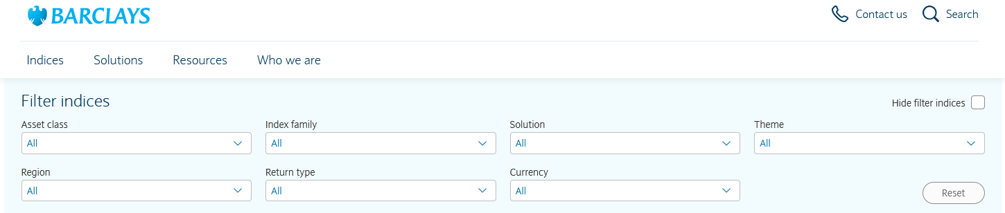 Наиболее известным индексом компании является Bloomberg Barclays US Aggregate Bond Index (AGG) с широкой базой облигаций (правительственных, корпоративных, ипотечных), взвешенных по рыночной капитализации и представляющих среднесрочные облигации инвестиционного уровня, торгуемые в Соединенных Штатах. Инвесторы часто используют индекс для общей оценки эффективности рынка облигаций США.