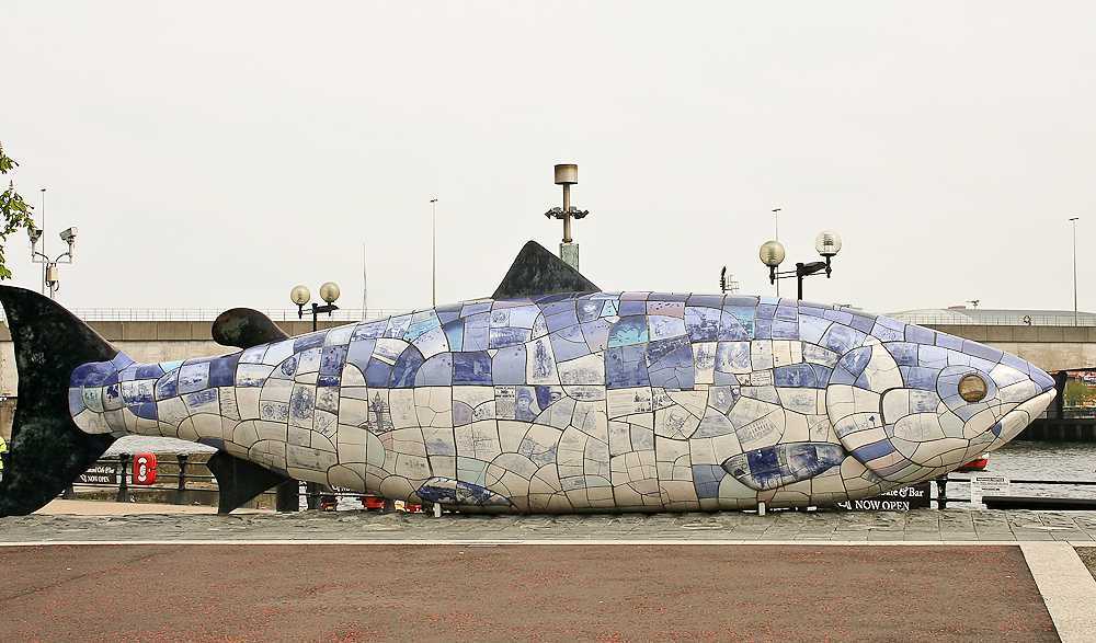 Самую примечательную скульптурную композицию города вы найдете неподалеку от его центральной части, где расположен мост, соединяющий два берега реки Лаган. Рядом с плотиной установлена керамическая рыба — символ промышленности североирландской столицы. Ее длина составляет десять метров