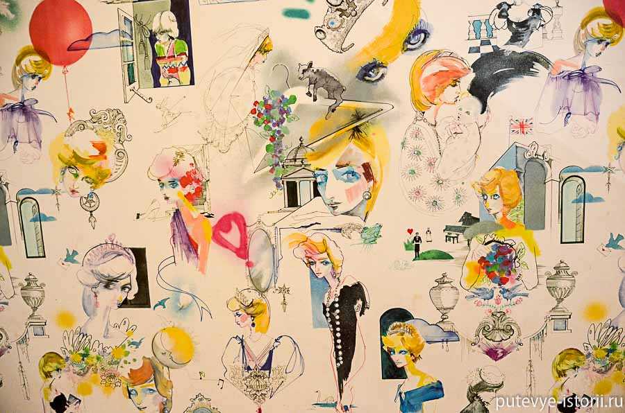Одна стена покрыта рисунками с изображениями принцессы Дианы.