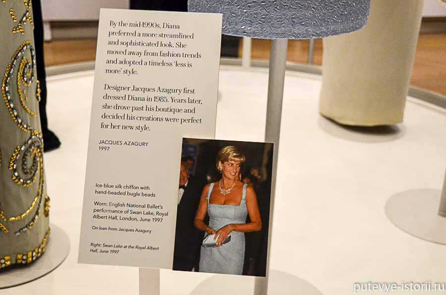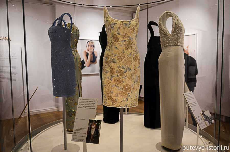 Выставка находится на первом этаже и занимает несколько залов. Официальное ее название «Diana: Her Fashion Story exhibition«. Как написано в анонсе, на выставке представлена эволюция вкусов принцессы от романтической скромницы до элегантной и гламурной светской женщины.
