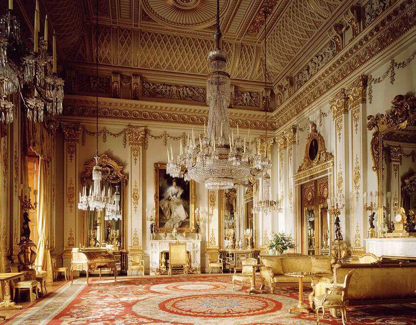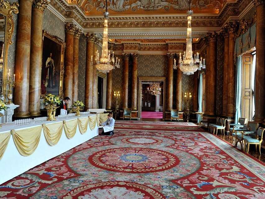 Также нельзя не обратить внимание на красные ковровые дорожки, украшающие Букингемский дворец (интересный факт, общая длина этих дорожек составляет около 5 км). Да и то, что во многих комнатах стены полностью покрыты шёлком, не может не привлекать внимание