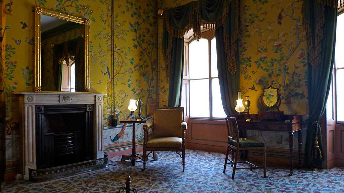 Например, в Парадной столовой — стены декорированы материалом красного цвета, в Белой гостиной – золотого, а в Зелёной комнате — стены соответствующего цвета сочетаются с золотым потолком.