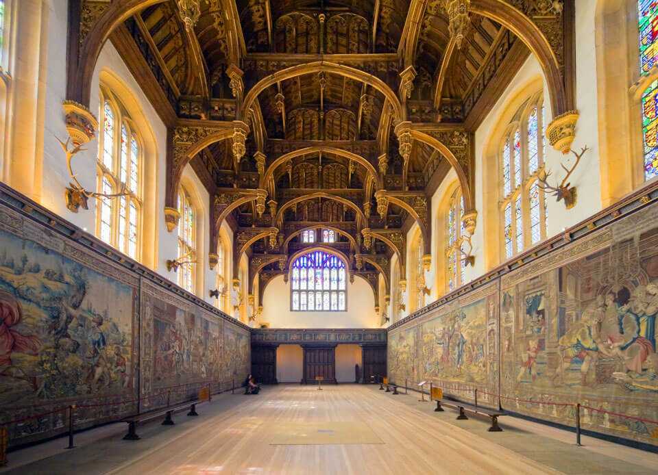 Большой зал. Епископ Уолси не предполагал наличие этого помещения. Зал перестроил для собственных нужд новый владелец – король. В нем обедали сам монарх и члены его семьи со свитой и гостями. Туристы не проходят мимо окна-эркера с цветными витражами. Сохранены резные перекрытия из дерева, потемневшие от времени. Интерьер дополняют гобелены и охотничьи трофеи.
