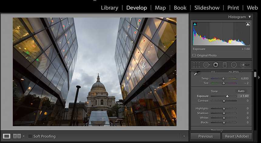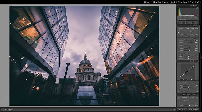 Градиентный фильтр был применен, чтобы восстановить некоторые детали в области неба, а также внизу изображения, чтобы уменьшить экспозицию и «закрыть» изображение, переводя взгляд к точке фокусировки – собору Святого Павла.