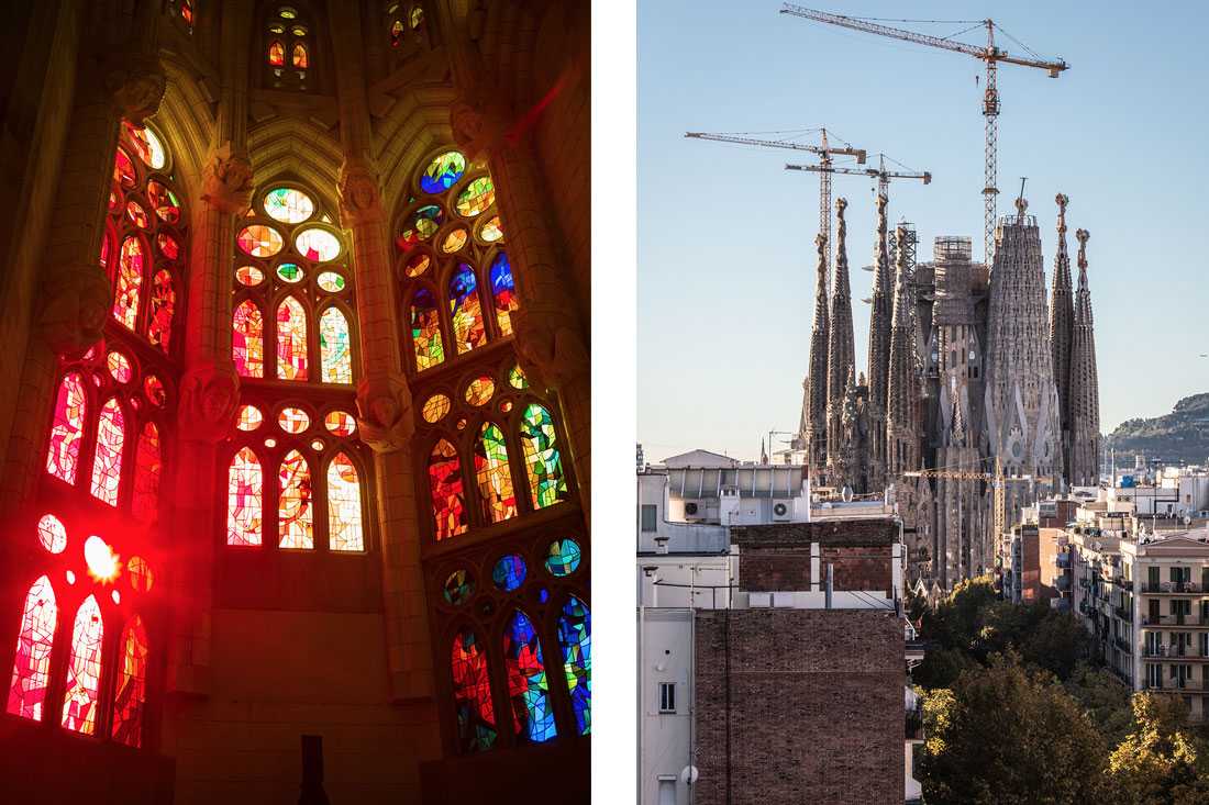 Гауди использовал уникальную систему освещения внутри храма: с одной стороны свет льётся через мозаику в тёплых тонах, а с другой стороны — в холодных.