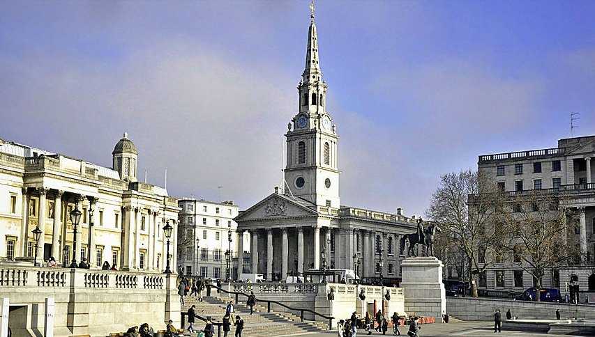 Вокруг площади располагаются Лондонская Национальная галерея, церковь Св. Мартина в полях (арх. Дж. Гиббс, 1721), Арка Адмиралтейства и несколько посольств.