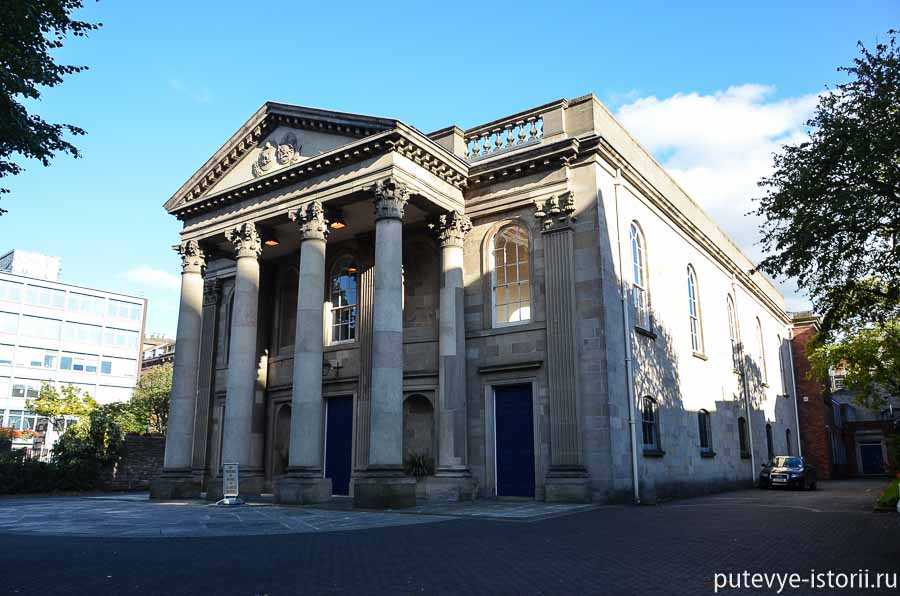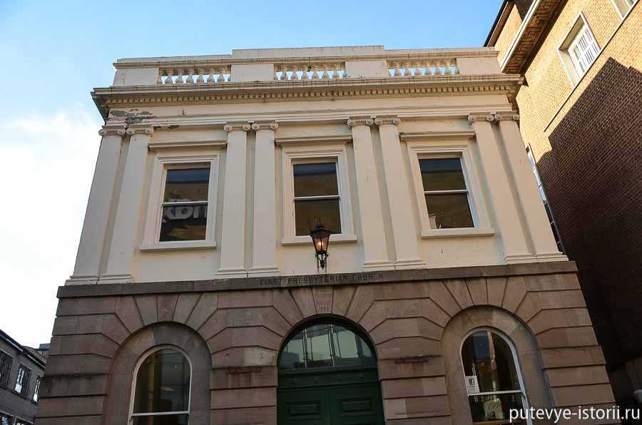 В Кафедральном квартале находится несколько церквей. И от церкви Святого Георгия я направилась к следующей церкви на улице Розмари. Которую нашла не сразу. И не мудрено. Никогда бы не подумала, что это безликое здание является церковью. Только из надписи на табличке я узнала, что это первая пресвитерианская церковь Белфаста, построенная в 1644 году. Настоящее здание построено в 1783 году.