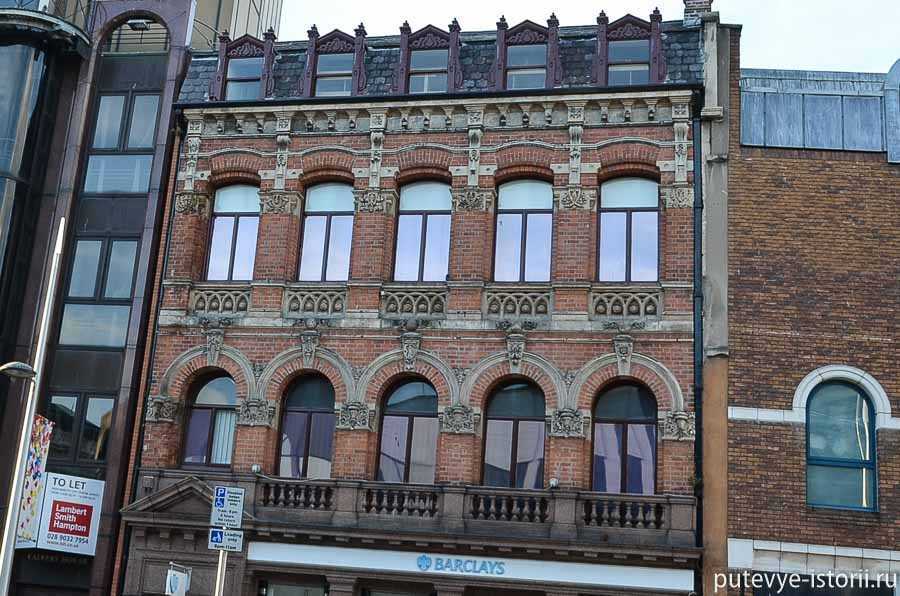 City Hall ( « City Hall ») работа Альфред Брамуэлл Томас (1868-1948), начиная с 1903 года , в Королевском университете ( ) и другие здания в стиле викторианской эпохи или эпохи короля Эдуарда украшены многочисленными статуями. Вы также можете обнаружить два других внушительных здания, в которых расположены банки: Ольстерский банк ( 1860 г. ) и Северный берег ( 1769 г. ).