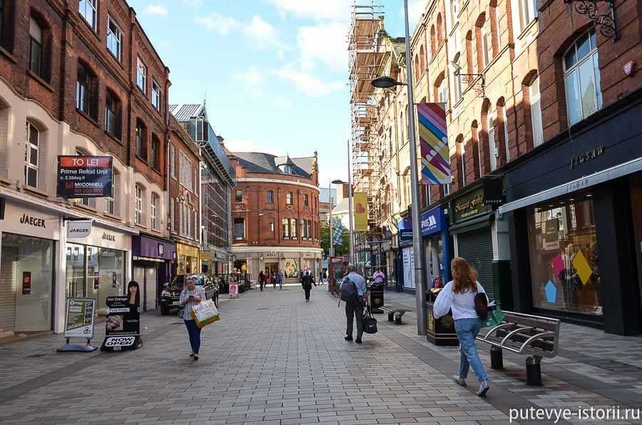 Справа от площади Артура начинается большой торговый центр Плаза Виктория. Влево уходит улица Cornmarket, бывший зерновой рынок. Она выводит на широкий проспект High street, ведущий в сторону реки Лаган. Ориентиром будет высокая, отдельно стоящая башня – Albert Memorial Clock.