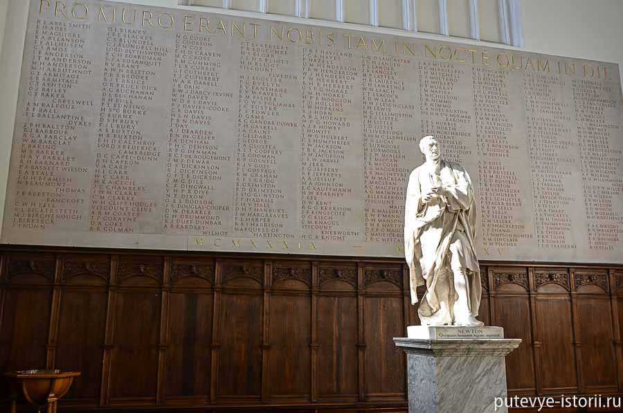 В часовне установлены памятники самым выдающимся деятелям Тринити-колледжа. Шестеро из них сидят в креслах, а один — Исаак Ньютон — стоит во главе.