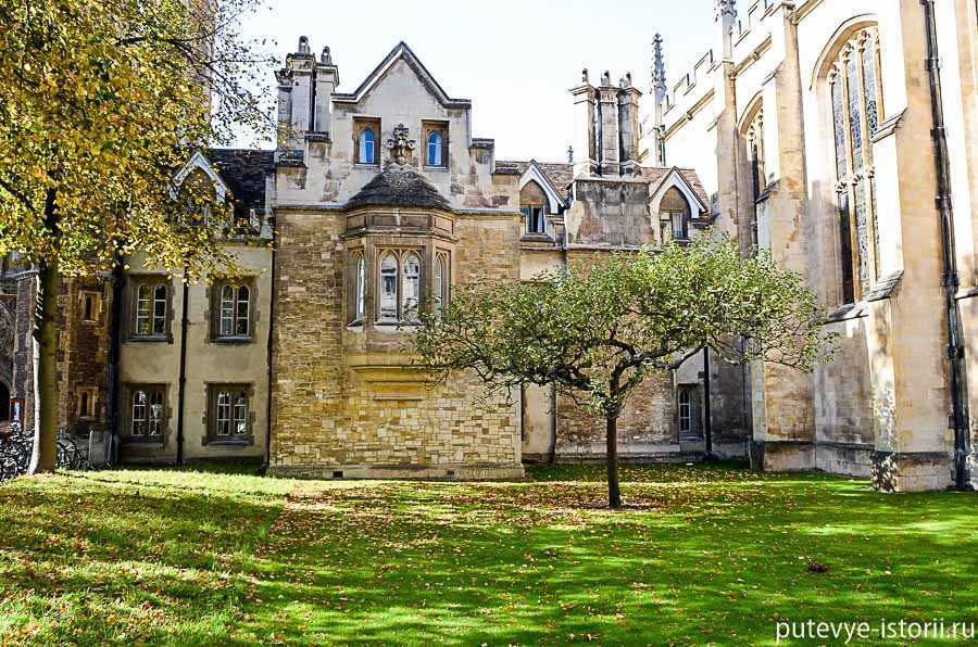 Справа от входа в тенистом уголке посажена яблоня — на том месте, где когда-то заснул студент Исаак Ньютон и был разбужен упавшим яблоком, что привело его впоследствии к открытию закона всемирного тяготения.