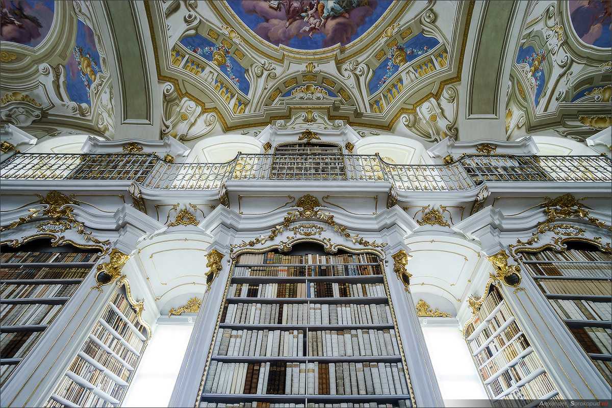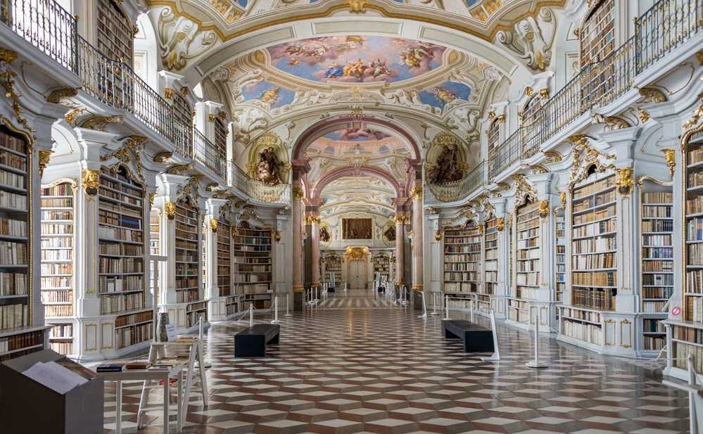 Библиотека Адмонта — поистине волшебное место, не только потому, что является местом хранения ценных книжных экземпляров, но еще и благодаря своей уникальной архитектуре и невероятно роскошному интерьеру, напоминающему больше дворец, нежели библиотеку. Обновленный интерьер предстал взору современников в далеком 1774 году и был выполнен в необычном, уже умирающем на тот момент стиле — рококо. Пол здания вымощен бело-коричневым добротным паркетом, а 30-метровые потолки являют собой настоящее произведение искусства: итальянский художник Б. Альтомонте создал на их поверхности невероятные фрески. Уникальная роспись затрагивает множество тем (за исключением религиозных): науку, искусства и других.