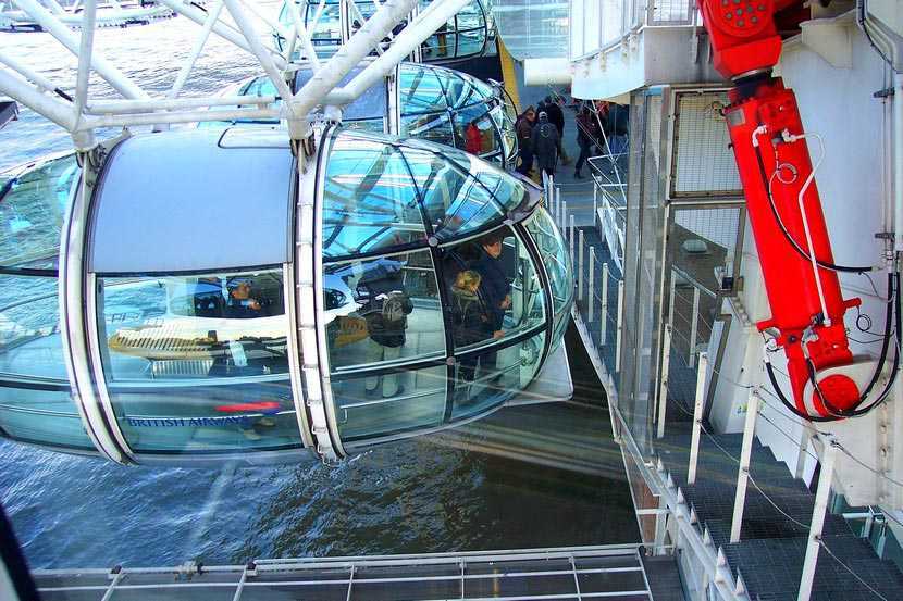Скорость движения «Лондонского глаза», который удивительно похож на обычное велосипедное колесо, позволяет пассажирам без труда успеть сесть в кабину-капсулу или выйти из нее. Кстати, каждая кабина рассчитана на 25 человек. Все они с комфортом могут совершить полет (!) над Лондоном, и при этом, не мешая друг другу. Как уже говорилось выше, размеры капсулы лондонского колеса обозрения огромны. В центре каждой кабины имеется лавочка, на которой можно передохнуть, наблюдая, как под тобой раскрывает все свои «секреты» великий Лондон. В жаркий день в капсуле не будет душно, в каждой из них работает система кондиционирования и вентиляции воздуха.