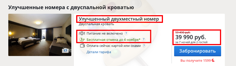 После выбора понравившегося вам отеля вы попадете на его страницу, где откроется много вариантов номеров. Среди них то и нужно выбрать тот, где указано «Оплатить в объекте размещения». Если случайно выберете другой номер, будете платить сразу с карты