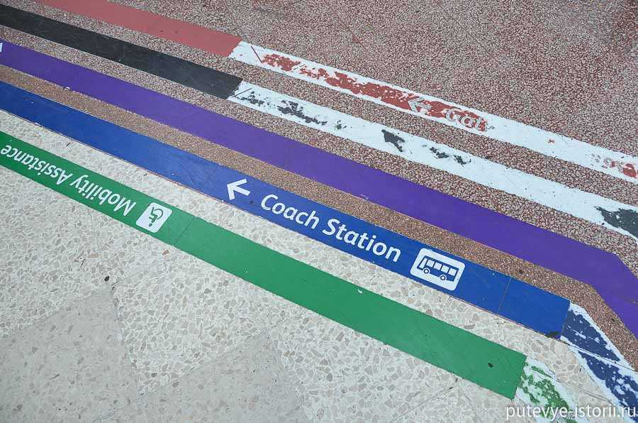 Мы покрутились около табло, а потом обратились к служащему, как дойти до автостанции. Тот показал нам на направляющие линии, нарисованные на полу вокзала.