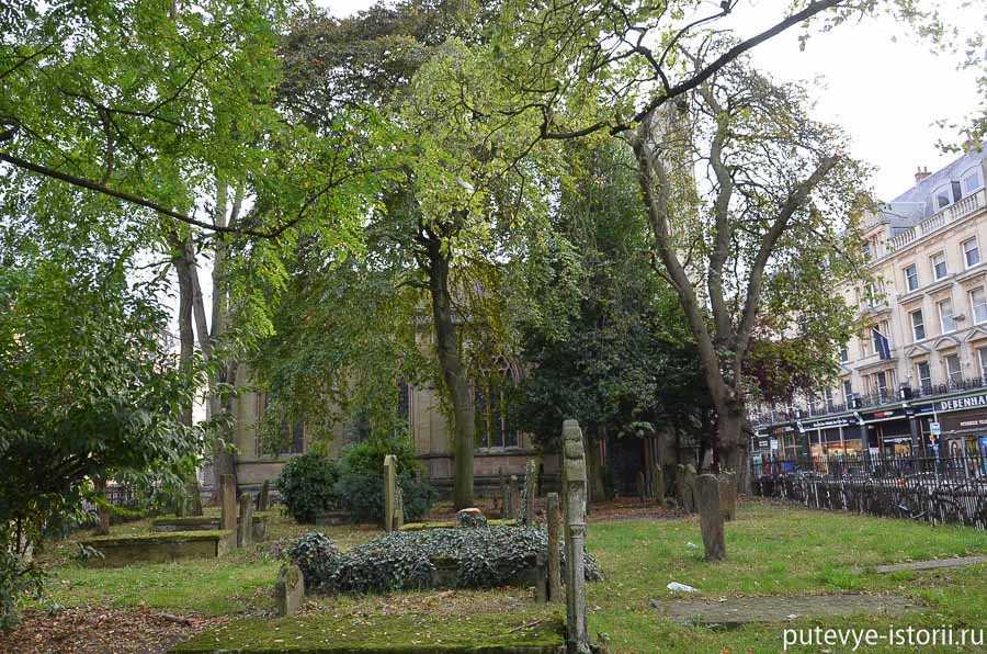 а за кладбищем возвышается обелиск. Это мемориал в память о сожженных в 1556 году трех англиканских епископах: Лэтимере, Ридли и Кранмере. По приказу Марии Тюдор их казнили за ересь. Памятник напоминает шпиль готической церкви, ушедшей под землю.