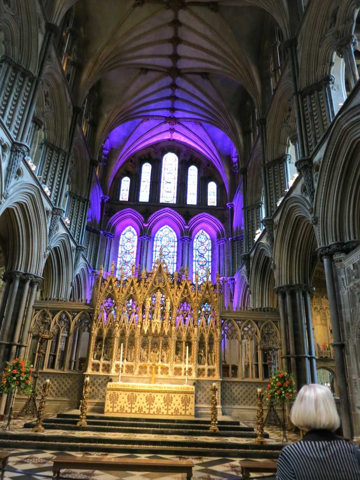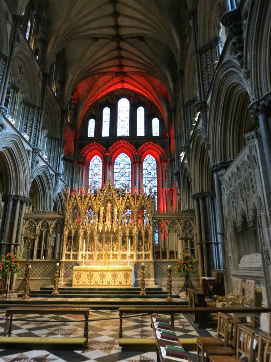 Главный алтарь собора с кружевной резьбой отдельных деталей великолепно смотрится на фоне цветных окон.