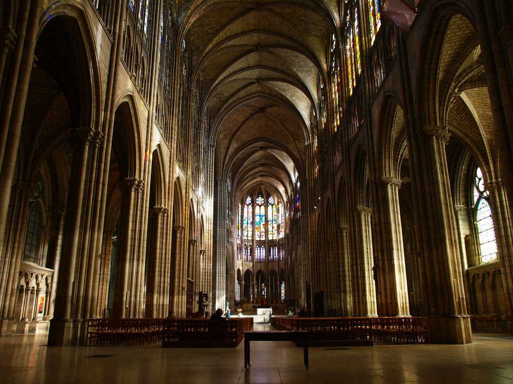 В трактате «Об освящении церкви Сен-Дени» Сугерий так описывал символичность конструкции храма: «Это корабль, в котором раскрыто содержание Вселенной. Вытянутое центральное пространство строения, отделенное от соседних вертикальными колоннами — неф. Эта Вселенная разделена верхними витражами и нижними колоннами на два мира: верхний — небесный и нижний — земной».