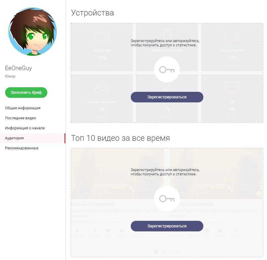 При переходе на отдельную страницу канала можно узнать также географию, данные по устройствам, топ-10 видео, динамику по просмотрам, но есть одно но – эта информация доступна после регистрации и модерации. Проверка аккаунта занимает как минимум один день, так что с расширенным поиском и анализом придется подождать.