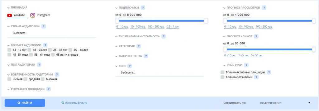 Площадки можно отфильтровать по активности, подписчикам, просмотрам, географическим и демографическим характеристикам, категории, тегам и даже прогнозируемым показателям по просмотрам и кликам.