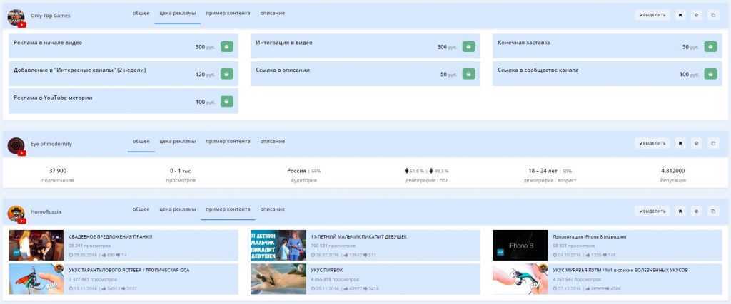 После регистрации вы можете открыть каталог YouTube-каналов, где увидите названия и значки каналов, а также такие данные: число подписчиков, диапазон просмотров, доля зрителей из России, демография (пол, возраст), репутация (внутренний показатель сервиса). На другой вкладке карточки канала сразу видно цены на различные виды рекламы.