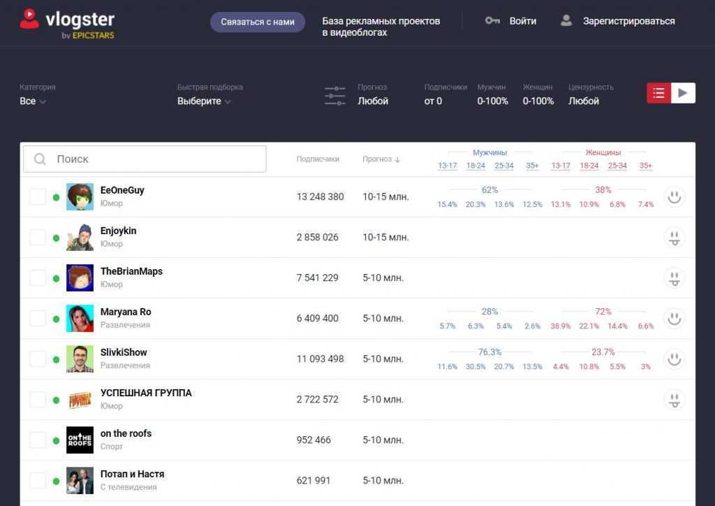 Vlogster – небольшая база видеоблогеров, готовых к рекламным интеграциям, дочерний проект EPICSTARS. В каталоге можно найти больше 1 000 YouTube-каналов по различным тематикам: компьютерные игры, красота и мода, музыка, фитнес и др.