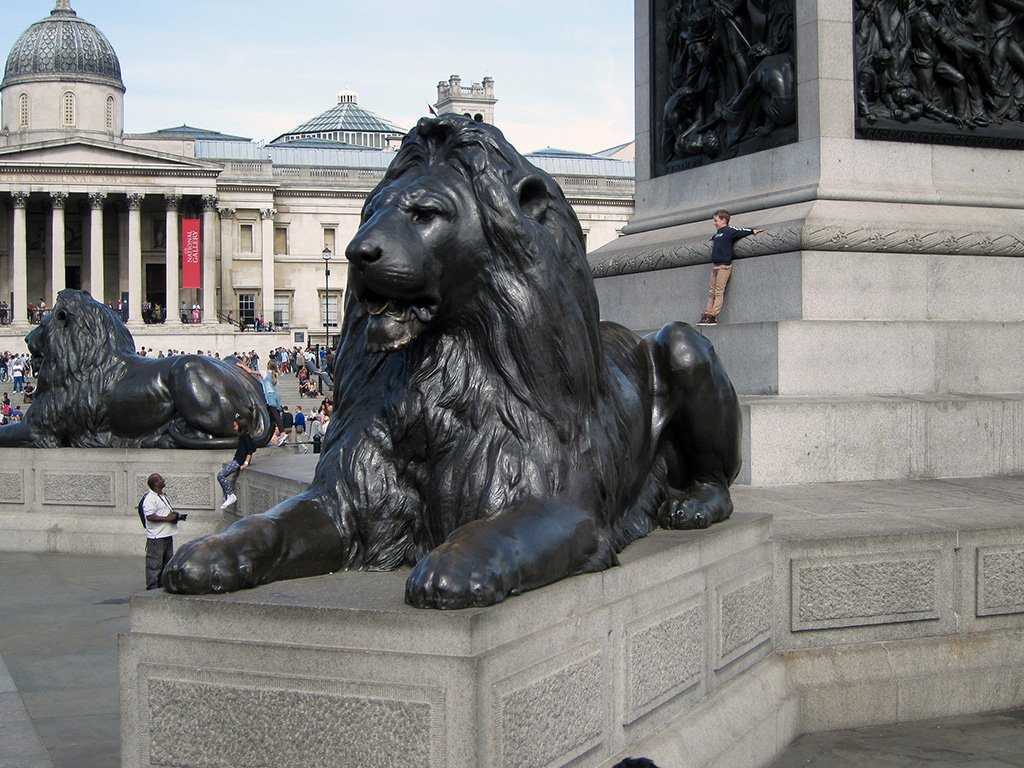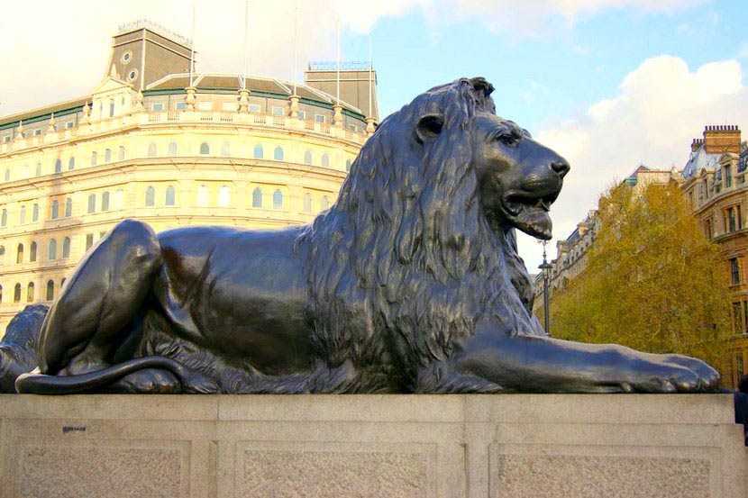 Одна из четырёх бронзовых фигур львов окружающих Колонну Нельсона