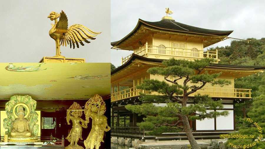 Самая главная достопримечательность Киото и одно из самых культовых достопримечательностей Японии — Золотой павильон Кинкакудзи. Этот храм дзен-буддизма первоначально был частной структурой, к концу 14-го преобразованной в храм. Трехэтажный павильон беспрепятственно объединяет три главных японских архитектурных стиля: Самурай, Дзен и Синден-Сукури. Имя павильона появилось благодаря желтой и золотой окраске, не говоря уже о ярком бронзовом украшении феникса на вершине крыши. Храм окружен красивыми ухоженными садами, демонстрирующими гармонию между Раем и Землей.
