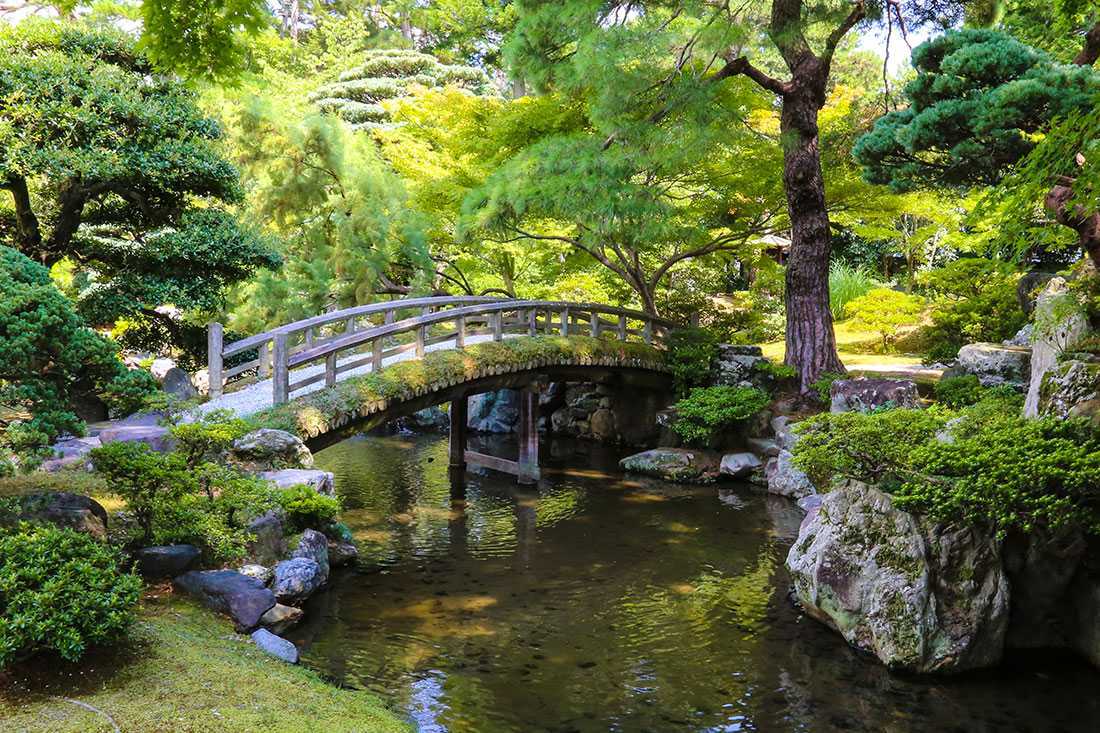 Здесь всё как положено — пруды, мостики, вымощенные камнем дорожки, и трава столь яркого зелёного цвета, что кажется, как будто кто-то переусердствовал с Фотошопом.