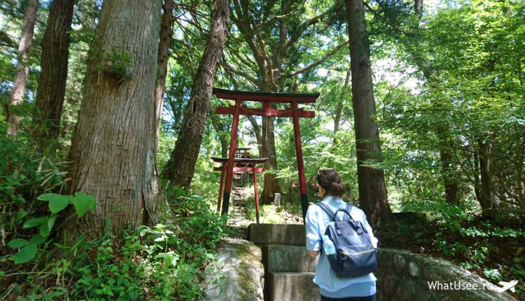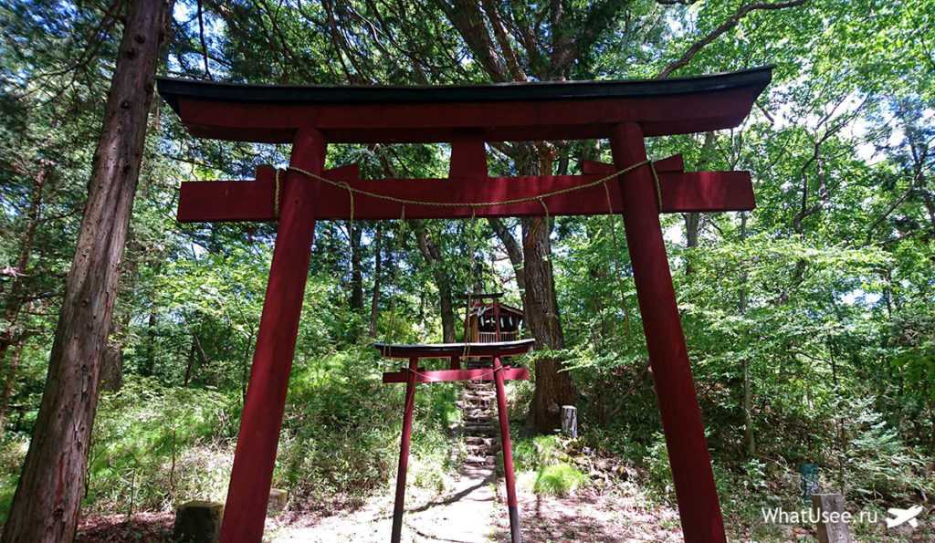 Свернув с моста налево, вы увидите небольшое синтоистское святилище Nukazukainari Shrine. Как и любое святилище синто, его легко отличить по красным ворота ториям.