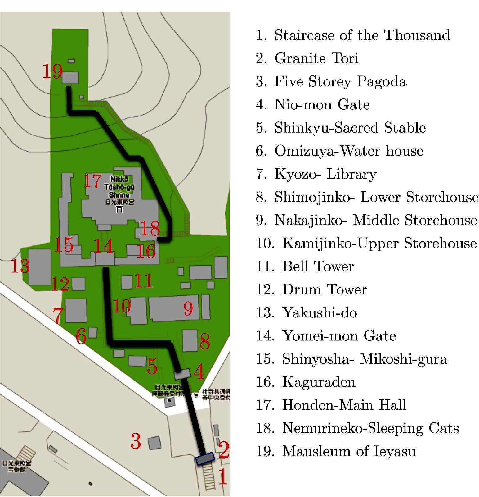 У выхода с моста приезжих встречает памятник князю Масацуна Мацудайре (Masatsuna Matsudaira), чьими усилиями воздвигнут храмовый комплекс и посажены тянущиеся на 40 км великолепные аллеи криптомерий, сохранившиеся до наших дней. Отсюда каменные ступени поведут приезжего к вершине холма, где воздвигнуты известные всему миру храмы.