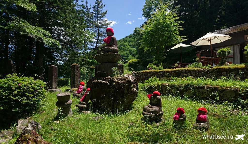 Вдоль реки тянется аллея каменных статуй Дзидзо.