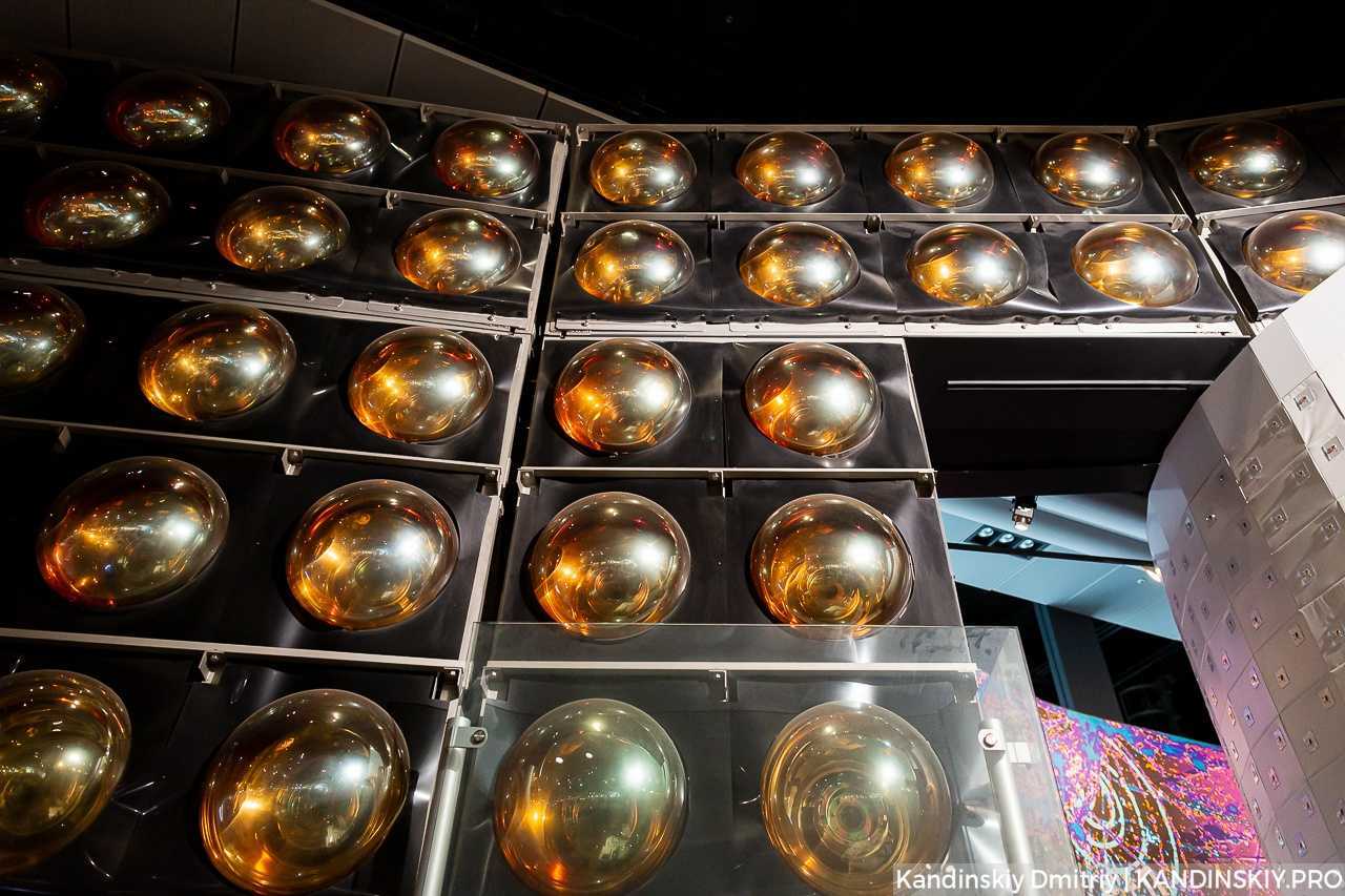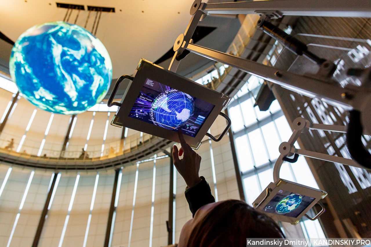 В центре музея на самом верху висит огромный «земной шар», собраный из экранов. На модели постоянно транслируется информация о передвижении ветра, температуре воздуха, которая поступает напрямую с метеостанции.