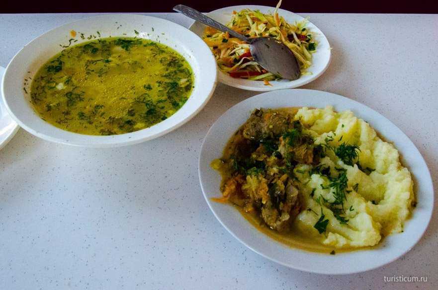 И тут же, почти напротив церкви Столовая №1. Замерзшие и усталые мы, как мотыльки на огонек, полетели в эту столовую. В заведении было пусто, но нас встретили как родных. Включили кондиционер чтобы мы согрелись и телевизор, чтобы фонил. Нам принесли настоящие домашние порции еды. Все было вкусно и недорого.