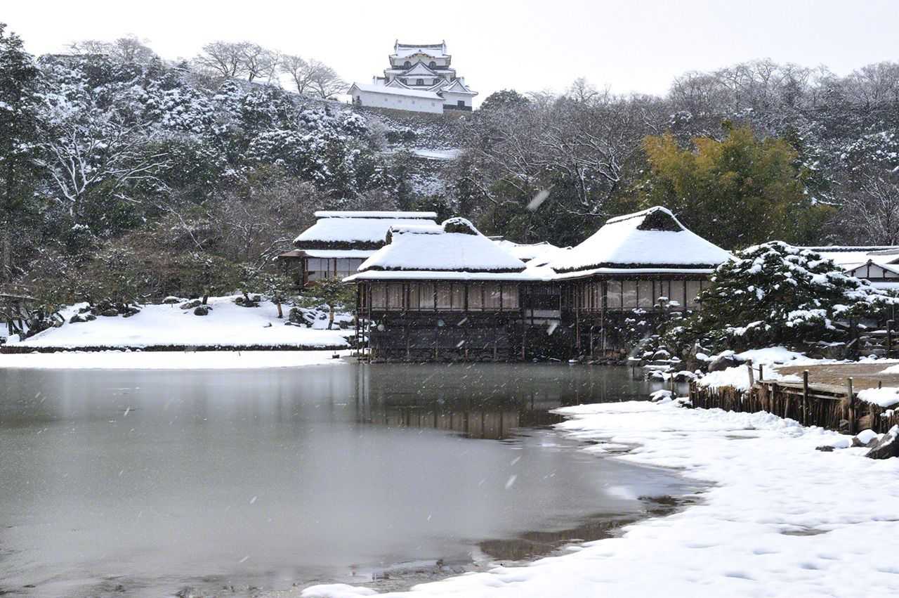 Вид на главную башню замка Хиконэ из заснеженного сада Гэнкюэн.