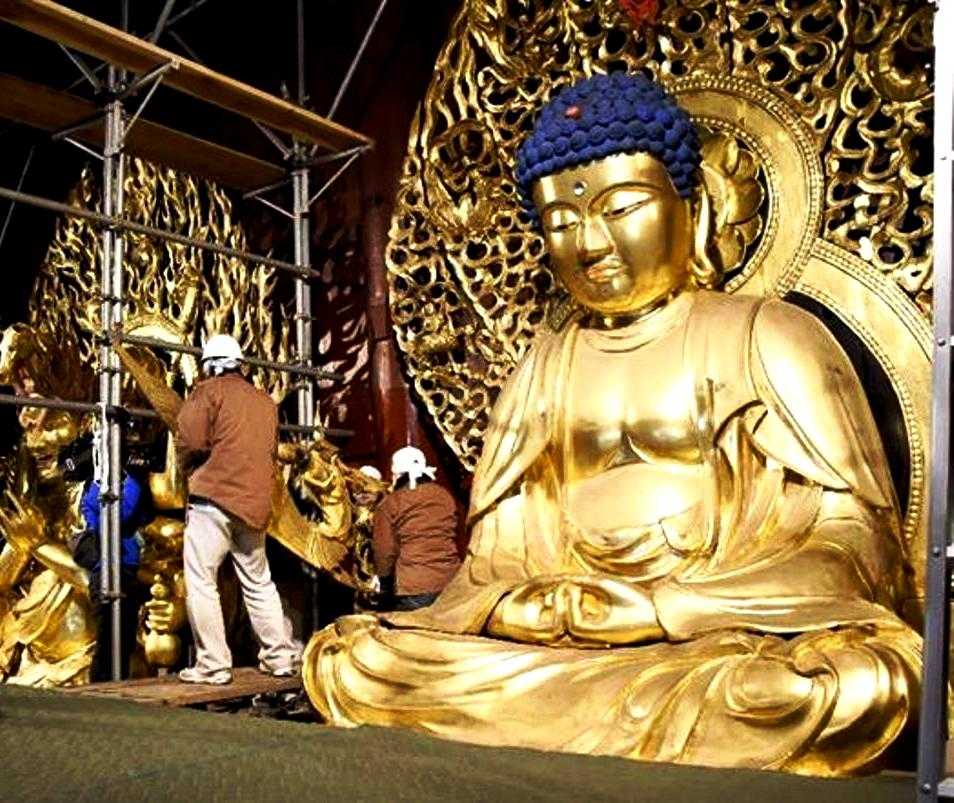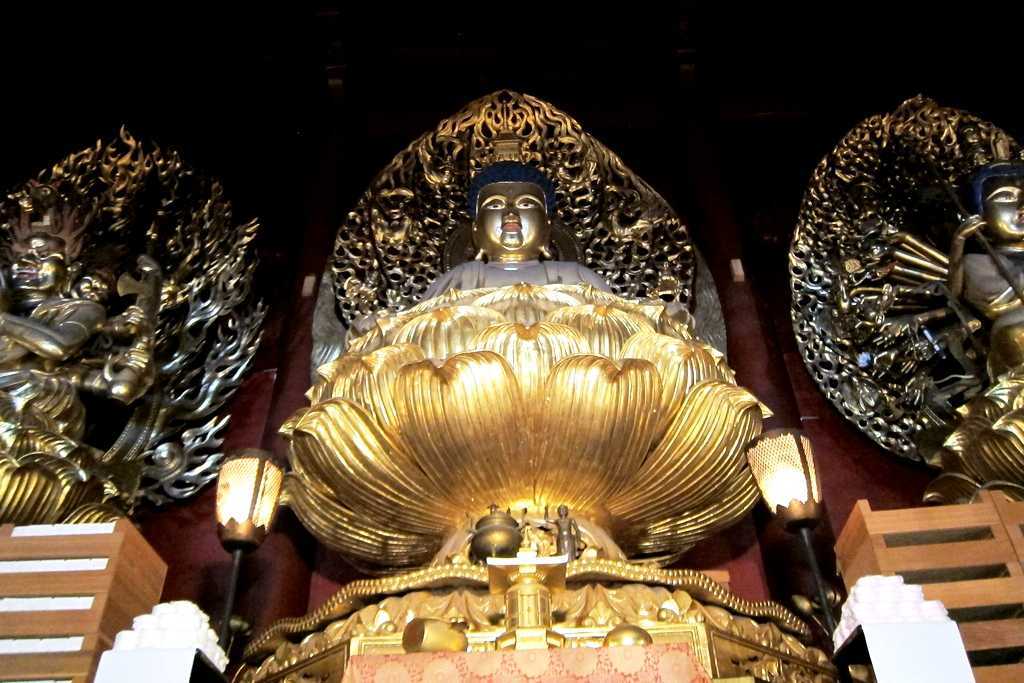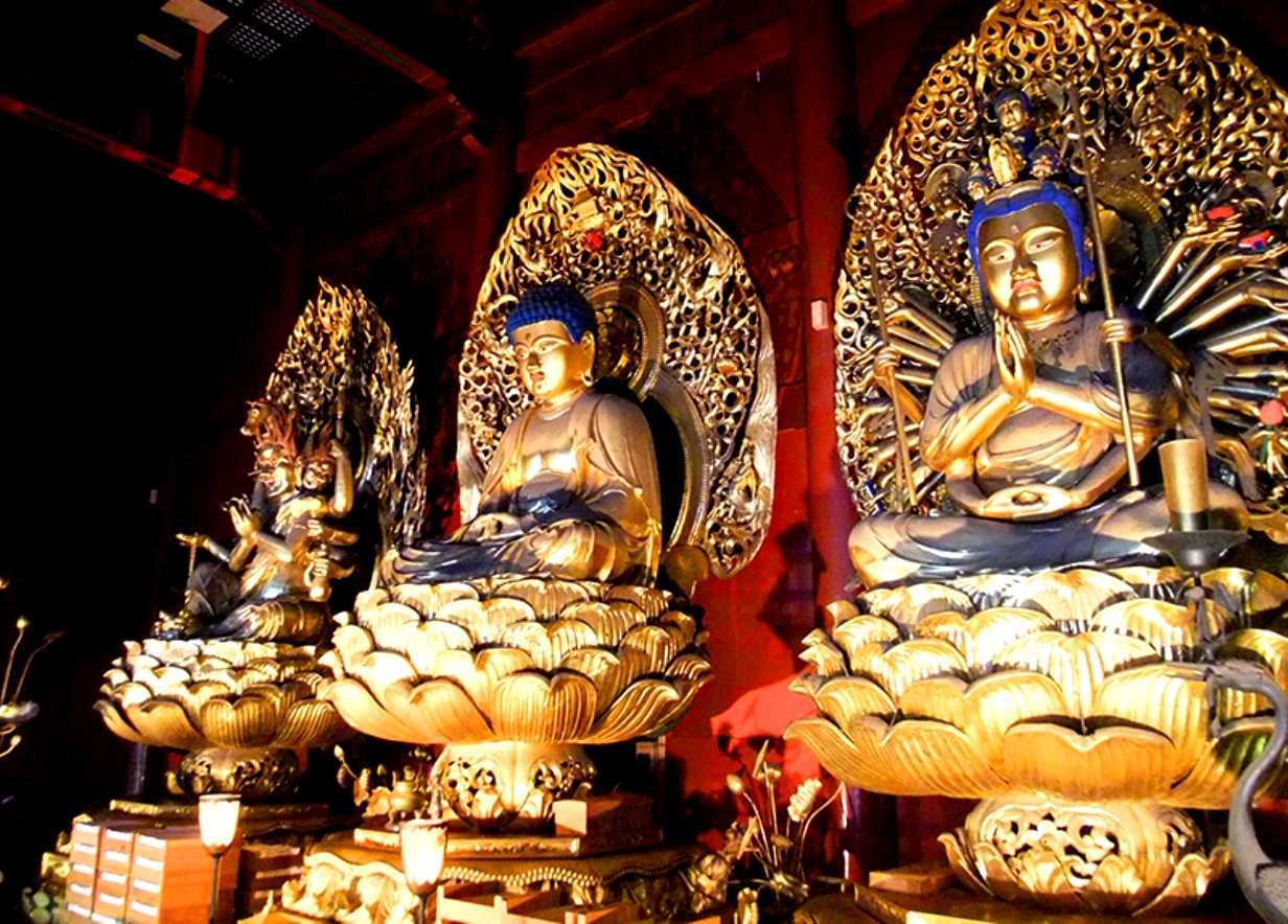 Основной зал Санбуцудо («Зал трех Будд») считается самым масштабным деревянным сооружением. Он содержит в центре три позолоченных изображения Будды Амида-Нерай (божество прощения), Сэндзю-Каннон («Каннон с тысячью рук»), божество справедливости и милосердия и Бато-Каннон («Каннон с головой лошади»), покровительствующее животным.