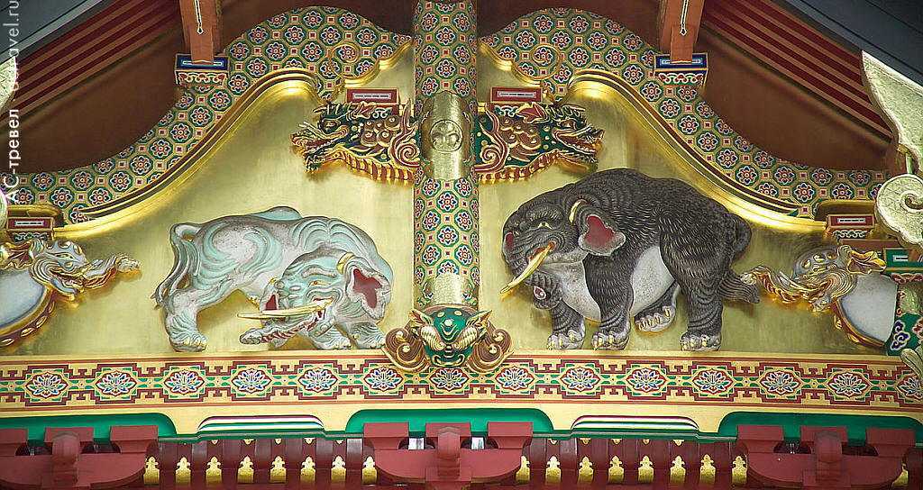 В прихотливой резьбе, украшающей Тосёгу, можно встретить много интересного и необычного. Вот, к примеру, слоны, известные японцам только по описаниям. Это грозные животные со страшными когтями.