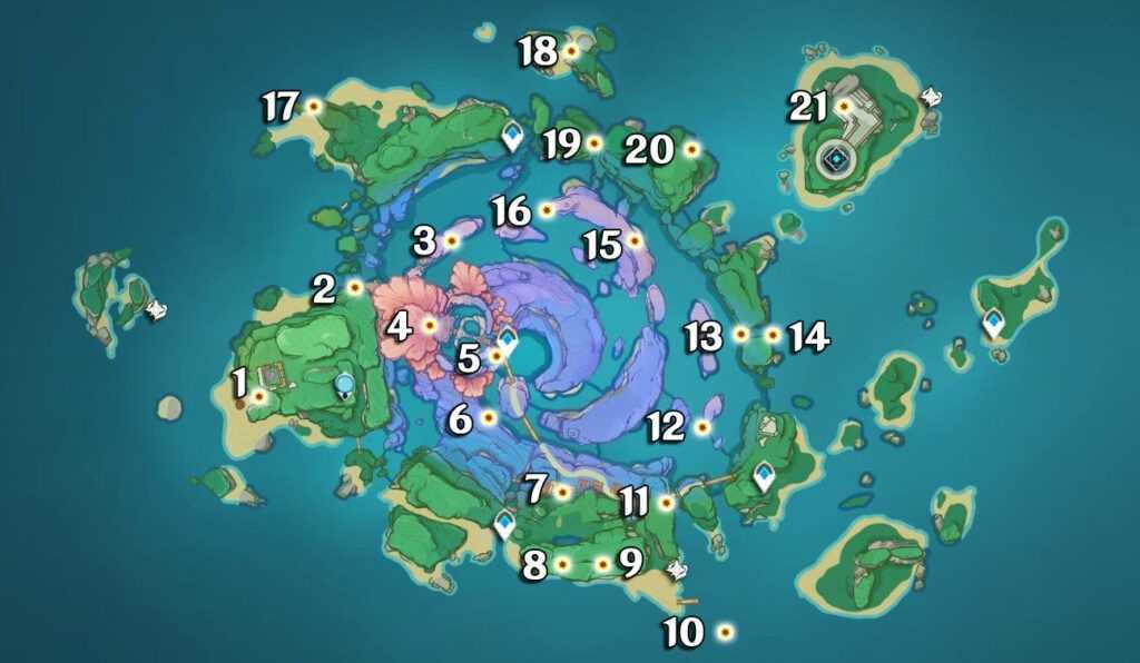Измените игровое время на 2 часа ночи и используйте Зрение стихии (колесико мышки) на солнечных часах. Это позволит вам увидеть скопление Анемо. Используйте на нем навык ветра, чтобы рассеять его. Найдите другие скопления. Их можно отыскать на юго-западе, востоке и на вершине самой высокой колонны острова (смотрите изображения ниже).