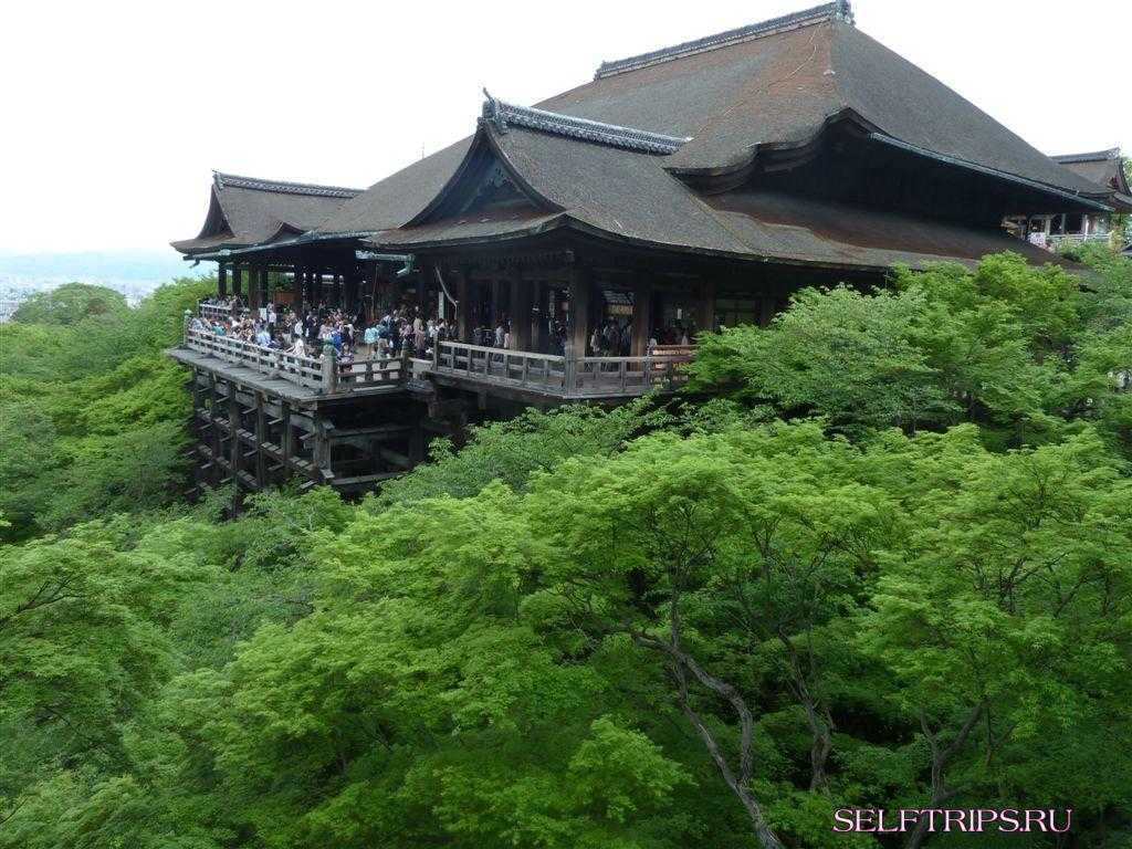 Прикол в том, что главный зал стоит на подпорках сделанных из здоровенных брёвен. Вот тут хорошо видно, как он поднимается над склоном холма, где расположен храм. Высота этой «веранды» — 13 метров.
