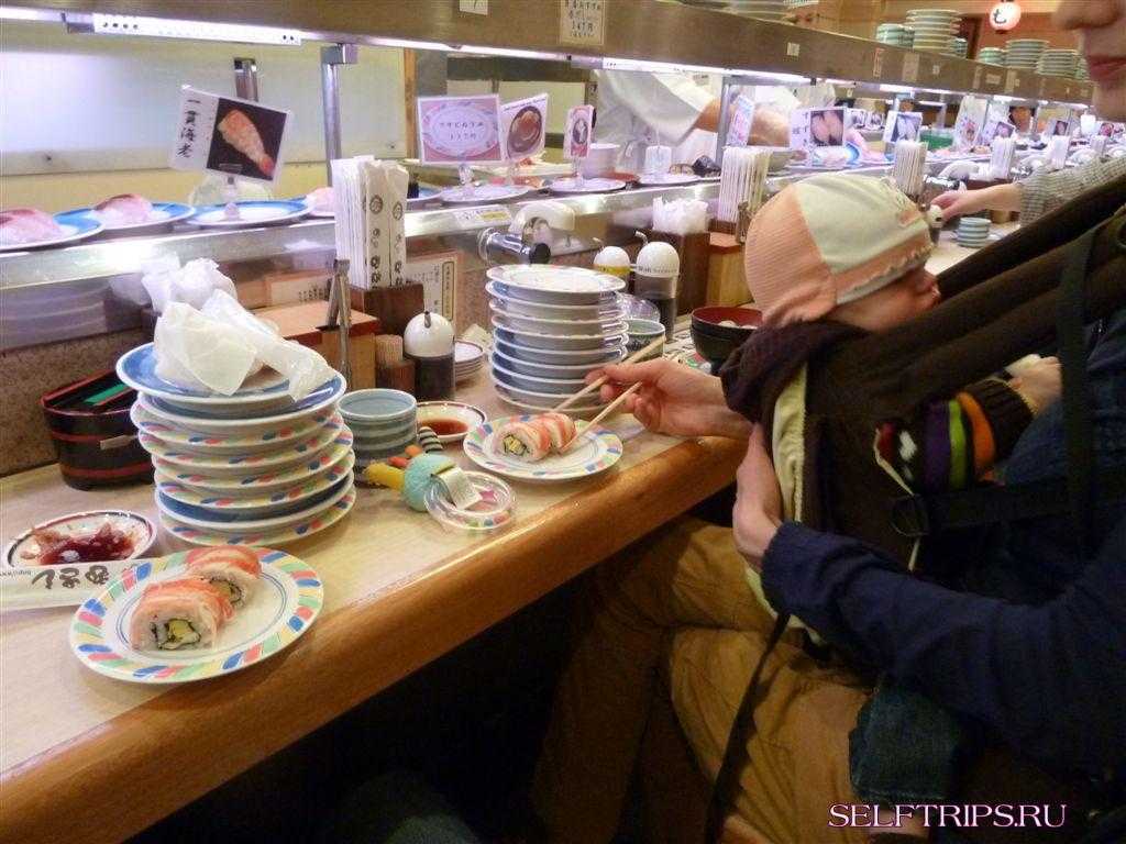 Вечером опять сходили в кафе где ездит суши по кругу — обожаем его!