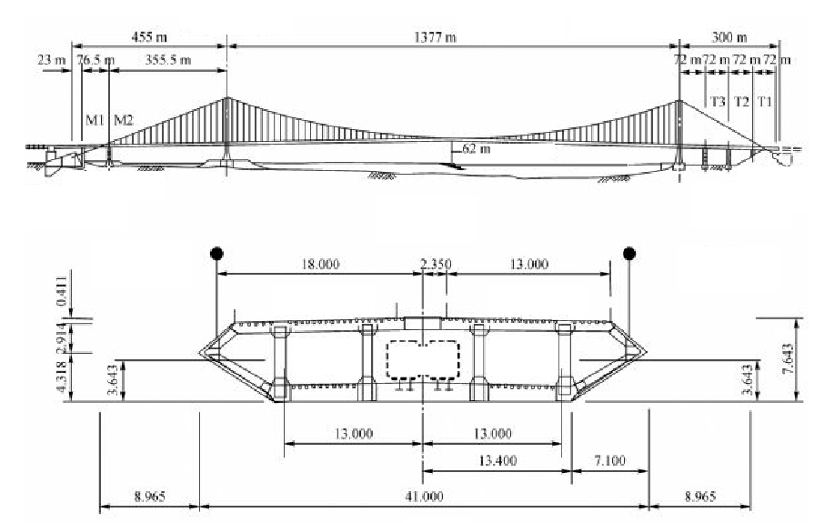 Он имеет центральный пролет длиной 1377 м, боковой 359 м (также висячей системы) и 300-метровую часть — трехпролетная неразрезная балка