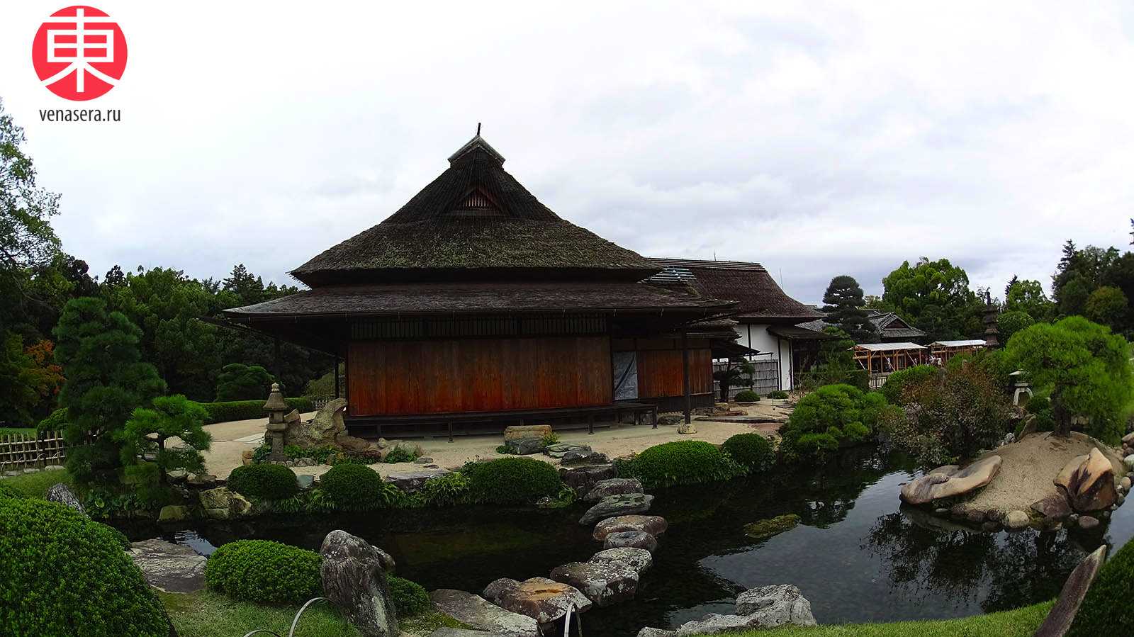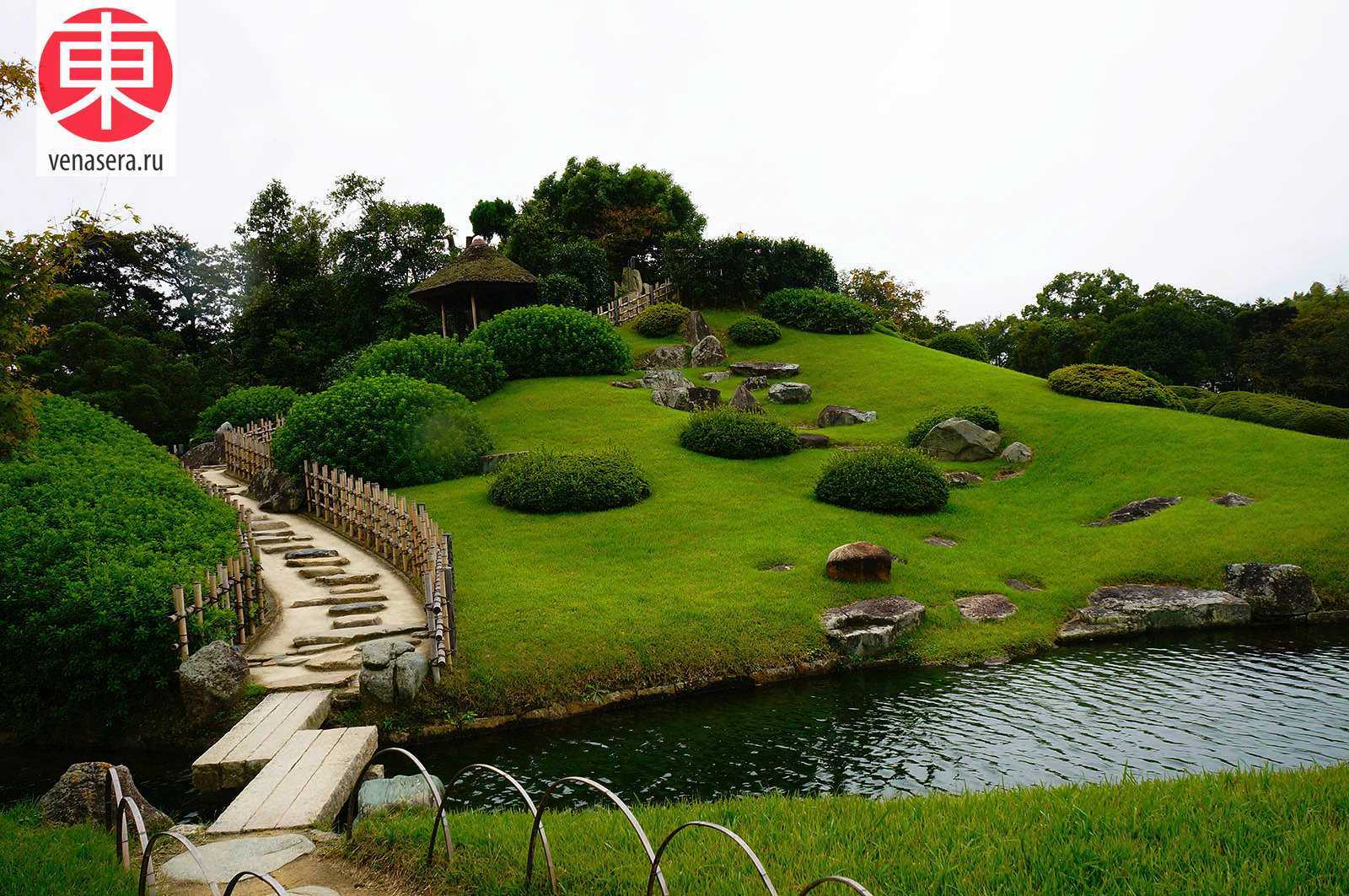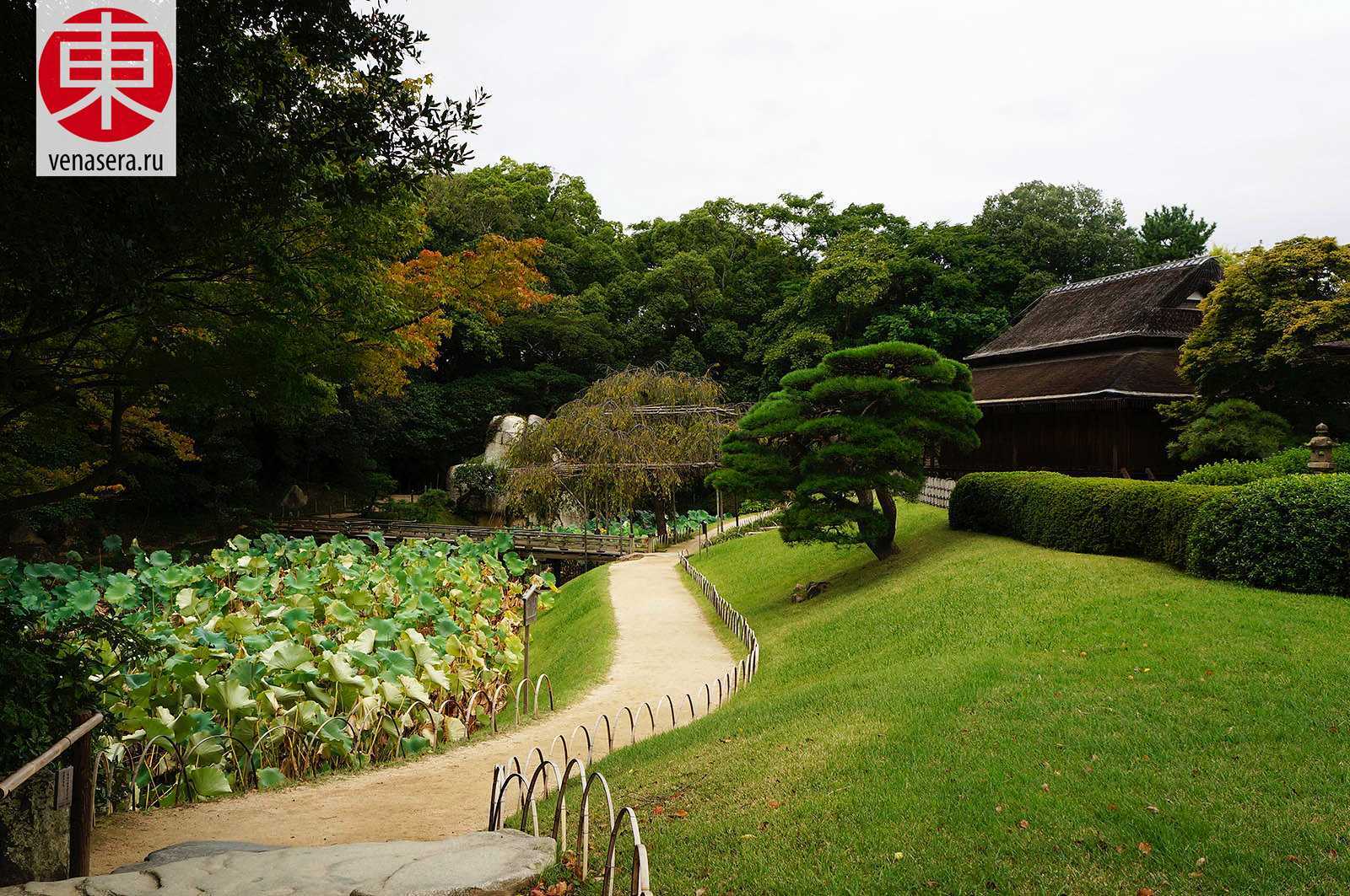Здесь есть чайные домики, а изящные павильоны стоят на лужайках в окружении кленов, вишневых и абрикосовых деревьев. Над ручьями перекинуты изящные мостики, а в июне по берегам цветут ирисы.