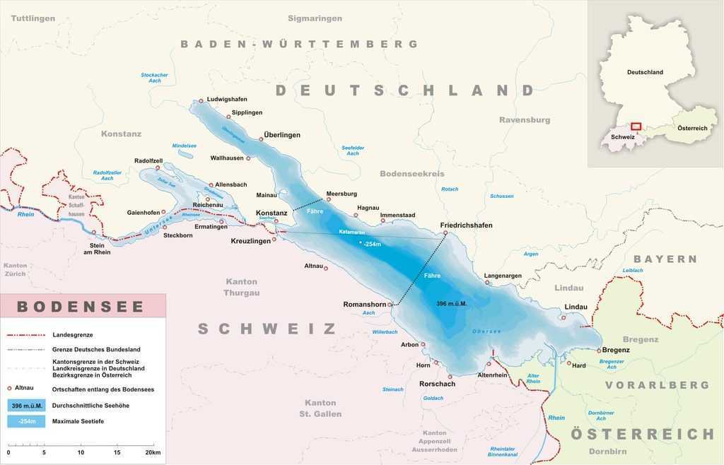 Боденское озеро находится в предгорьях Альп, на территории трех стран: Германии, Швейцарии и Австрии. Длина берегов двух озер, составляющих его, составляет 273 км : 173 км в Германии, 28 км в Австрии и 72 км в Швейцарии.