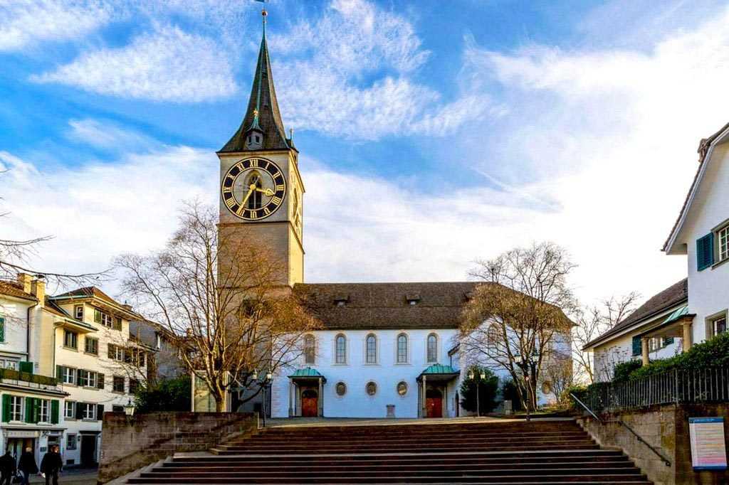 Храм, воздвигнутый в честь Святого Петра, появился в Цюрихе в 9 веке. За столь длительный период существования церковь неоднократно перестраивалась, но ее главные архитектурные «фишки» остались во внешнем облике церкви. Высокая и заметная издалека башня с часами возникла у церкви в 16 веке. Вторая башня с колокольней всегда помогала жителям города своевременно узнавать о пожарах и иных бедствиях. Кстати, часы на башне Святого Петра показывают точное время даже в наши дни. Орган и смотровая площадка делают храм еще более привлекательным для туристов. Храмовые ворота открыты ежедневно 8.00 до 18.00, в выходные с 11.00. К церкви возможно приехать на трамваях 4 и 15.