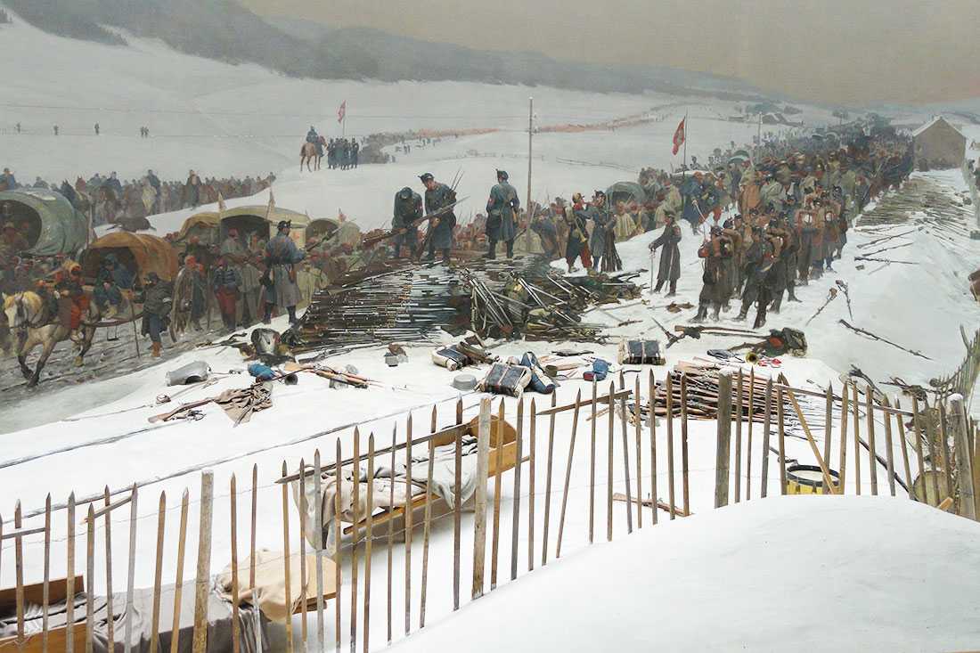 В начале 1870-х годов швейцарский художник Эдуард Кастр написал грандиозное полотно размером 112 на 10 м. Это одна из немногих масштабных панорам XIX века, сохранившихся до наших дней. На картине изображена сцена отступления французской армии под командованием генерала Бурбаки зимой 1871 года. На фоне снежных пейзажей измученные солдаты пересекают границу, отступая в нейтральную Швейцарию.
