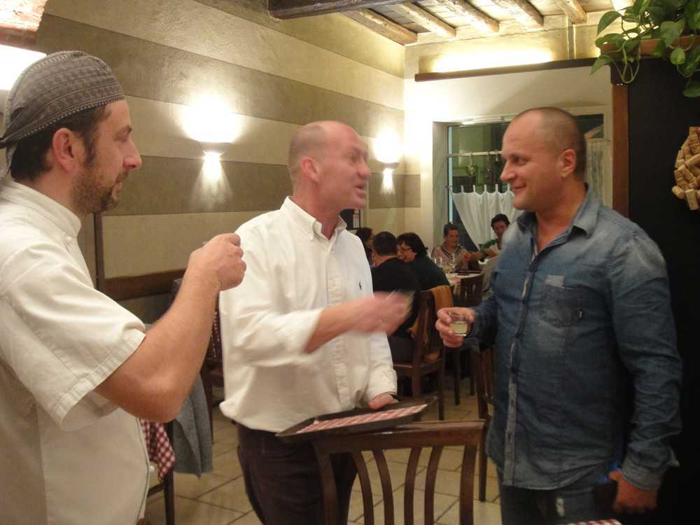 Некоторое время петляли по односторонним улицам и наконец, проехав под кирпич — все равно на улице пусто, даже собак хозяева в такой вечер гулять не пускают — и вижу табличку: «Две птицы» … Очень заманчиво. И вот мы внутри. За большим столом гуляет компания. Еще за одним столиком сидят два серьезных дядьки. Все итальянцы, местные. То что надо.