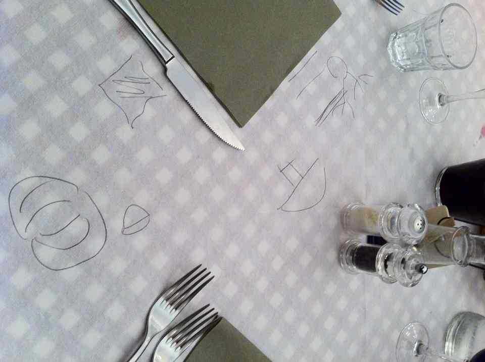 Интересен кадр из нашего обсуждения с Андрэ — официантом траттории — нашего ужина. Прямо на скатерти.