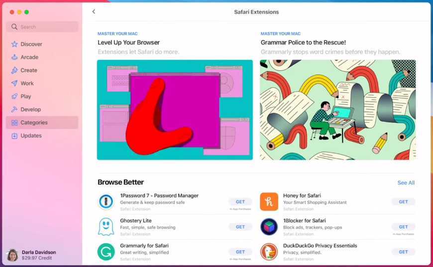 Расширения для Safari. Компания Apple вводит поддержку для WevExtensions API, чтобы пользователи могли легко переносить расширения, созданные ими для других браузеров. В Mac App Store для этого создана новая категория для расширений для Safari, чтобы пользователи могли легко их найти.