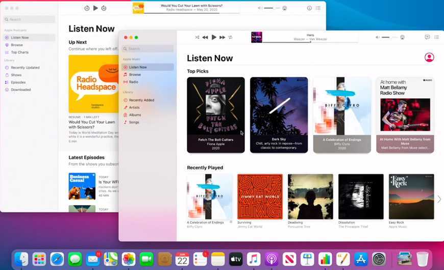 Иконки в доке округлились, их контур теперь (как в iOS и iPadOS) – квадрат с однообразно закругленными краями. Все операционные системы Apple, очень скоро, будут одной крови. Процесс уже идет. В течение двух ближайших лет macOS избавится от наследия прошлого и будет работать с теми же ARM-процессорами, что и остальные ОС компании, от audioOS (в HomePod) до watchOS.