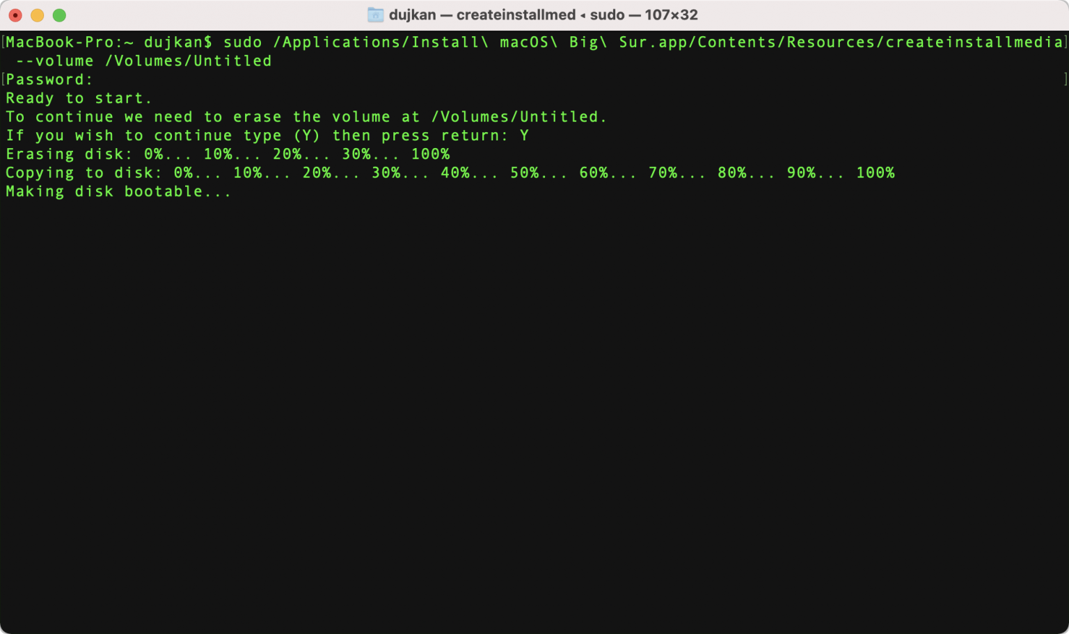 sudo /Applications/Install\ macOS\ Big\ Sur.app/Contents/Resources/createinstallmedia --volume /Volumes/Untitled